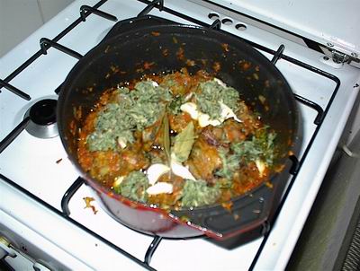 Вопщем всё это барахло бросать в козан..., и шышки тоже блять, как не жалко, но надо бросить туда, в кипящее и шкварчащее мясо, все тщательно перемешать на посдледок...