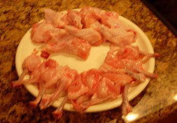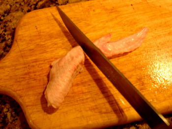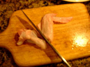 Итак, купив с дюжину свежих крылышкоф и помыф их харашенько, начинаем разделывать. Сначала отрезаем у крылышка, так сказать, плечевую часть.
