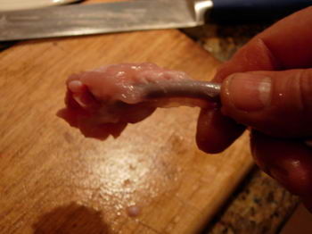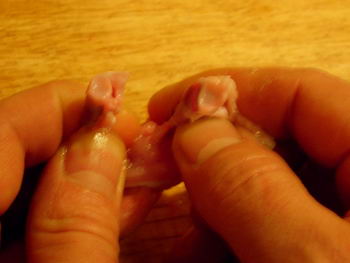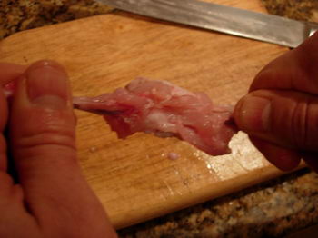 Обнажив кости, выворачиваем кусок крылошка наизнанку, как матку, и удаляем тонкую кость.