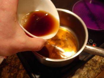 Ставим кофшик на плиту, даем соусу вскипеть и варим, помешивая иго, на медленном агне, пока он не выпарится примерно одна треть. После этого охлаждаем соус, атставив его в сторону.