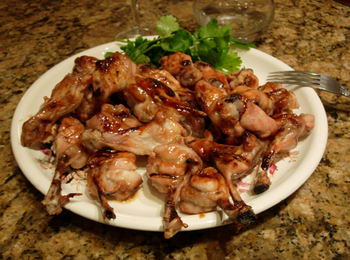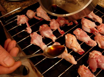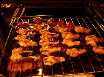 Типерь разагреваем духофку, дастаем противень, ставим на противень духовочную ришетку и укладываем на нее кусочки крылышкоф. Загоняем решетку с противнем под самый верх духофки и включаем, если есть, гриль (а нет, так и хуй с ним). При условии, что духофка разагрета до 250 градусоф, выдерживаем крылошки минут 10, пока с них не начнет капать сок. Вынимаем все это дело наружу и паливаем каждый кусочек ахлажденным соусом.
