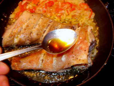 20.24. Не дажидаясь, пака схватится другая старана рыпки, бирем втарую плошку с разведенным соусом и выливаем на каждую рыпку по сталовой лошке энтого соуса.