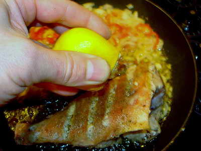 20.28 Пришло время убавить агонь наполовину от максимума, вновь перевернуть рыпку и проделать с перевернутой стороной то же самое, что мы сделали со стороной предыдущей: полить соусом ис плошки, поперчить и абдать соком лемона.