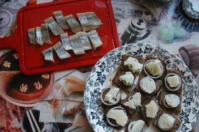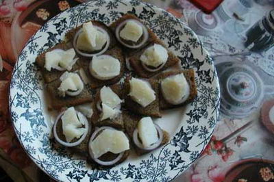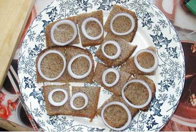 Хлеб с селедкой и луком.