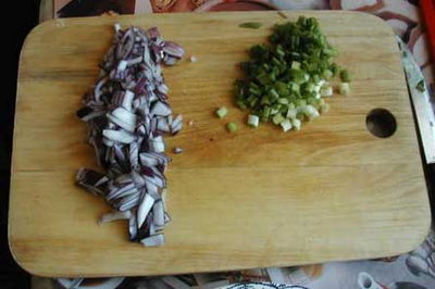 5. Остальной лук нарезаем помельче. Также измельчаем зеленый лук.