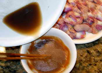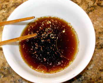 Тем временем я занялся пригатавлением заправочного соуса, который мне должен был понадобитца в конце гатофки. Для этого есчо в одной плошке я развел две сталовые лошки кетчуба, три сталовые лошки виноградного уксуса, лошку соивого соуса, лошку сахарного писку и означенные две лошки пшеничной муки. Перемешал фсе харашенько и также отложил в сторону.