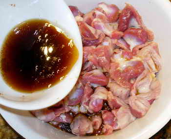 Дождавшись, когда желудки замаринуютца в отпущенные им 20 минут, вынул их из маринада, переложив в чистую сухую тарелку, а оставшийся маринад слил в плошку с приготовленным до этого соусом.
