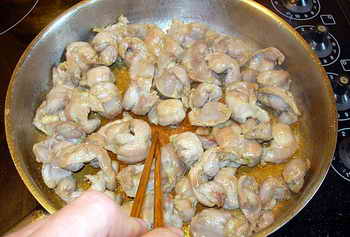 На разагретую скаваротку влил означенное количество растительного масла, дождался, кагда оно сагреетца и слегка обжарил в нем желудки.