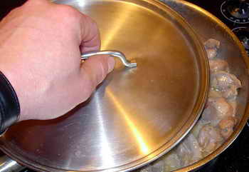 Затем влил в скаваротку примерно поллитра кипятка и прикрыл все это дело крышкой, оставив желудки тушиться на медленном огне.