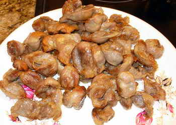 Дождавшись, когда ис скаваротки с желудками выкипит вода, попробовал кусочек желудка на зуб. Дело в том, что на данном этапе надо было добиться, чтобы желудок дошол до полной гатовности.. Если этого не произошло, следует его потушить есчо с небольшим количеством вады. Как только я убедился, что желудки гатовы, дожарил их в оставшемся масле до румяного состояния и выложил на отдельную тарелку, стараясь при этом не прихватывать масло ис скаварады.