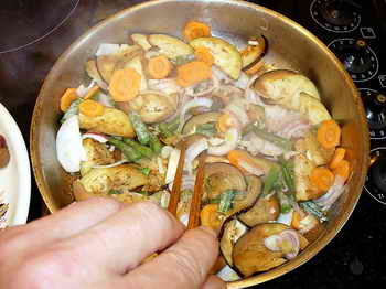 Используя аставшееся в скавараде масло, загрузил овосчи «первого эшелона», обжаривая их при интенсивном перемешивании.