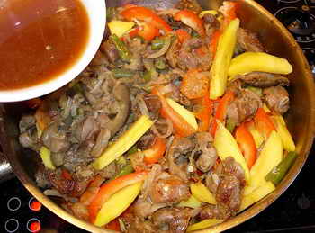 Много позже, когда мне довелось вживую пазнакомился с кетайской кухней, оказалось, что тогда, с желудками, по части идеологии и технологии их пригатавления я не шибко погрешил против истины. Готовят ли китайцы желудки именно так – не знаю: их кухня насчитывает более двух миллионов рицептоф, за всеми не угонишься. Но попробовать это блюдо именно в таком сочетании овощей, манго, специй и соусоф, придающих ему богатый контрастный вкус, рекомендую.