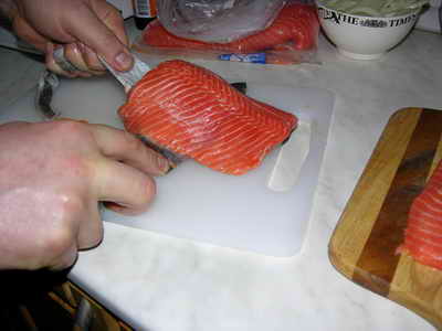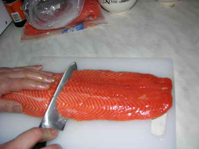 У нас было 2 куска филе форели. С нимаем с них шкурку и делим каждый пополам.