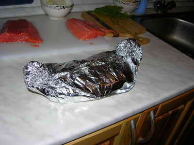 Кладем свехну немного укропа, поливаем нашим соусом, сверху кладем второй кусок форели и солим.