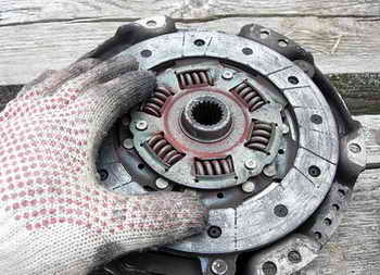 Отвинчиваем корзину сцепления от маховика и выясняем причины, почему оно наебнулось. По моему диску сцепления видно, что он изношен до безобразия.