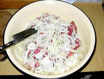Сначала срезаем излишки жыра, отложив их в сторону. Затем нарезаем мясо небольшыми кусочками, примерно 2 на 3 сантиметра (если используется нежырная свинина, поступаем аналогично). Складываем мясо в миску и добавляем к нему небольшие (сантиметр на сантиметр) кусочки нарезанного сала, которое мы откладывали.