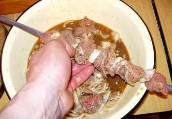 По прошествии 20-30 минут с тех пор как мы поставили мясо мариновацца, идем насаживать его на шампуры. Технология насадки следующая: лук с мяса стряхиваетца и отправляется нахуй, а каждый кусочек мяса чередуетца с кусочком сала. Причем сажается это дело так, чтоб мясо с салом неплотно, но соприкасались. Наличие в маринаде воды и последующая отдача салом своих сокоф мясу, сделает шашлык очень сочным. А капающий на угли жырок придаст шашлыку его непофторимый запах.