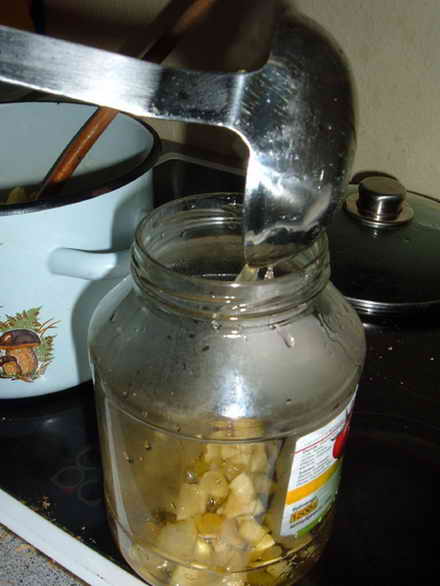 Чистим, режем аналогично яблокам, засыпаем всё сахаром (1 кг/ не ам, а просто в тысячах граммах один раз), мешаем.