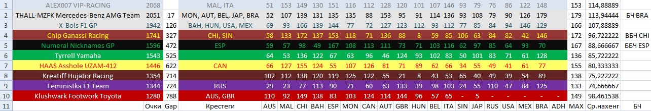 В Удаффрейсе же с интригой таки всё не так печально. Пусть Станичник и обладает преимуществом в 17 баллов, и скорее всего сохранит первое место (любой букмекер скажет, што проёбывать по 20-30 баллов две гонки подряд любому из соперников – это маловероятное событие), но по крайней мере за вторую строчку развернёцца охуительная борьба! И всё ещо открыт вопрос об обладателе Купка Конструкторов – 17 баллов между двумя лидирующими командами являюцца куда менее непреодолимой разницей в рамках одной гонки. Зарубимсо!