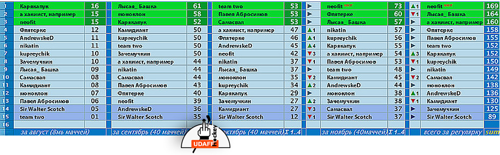 Если у прошлом месице Имбирь и Паравозек ибашили таг, что все охуевали от их результативных серий, то в этом месяце наблюдалсо «запланированный спад», особенно у Локо. (Небось одно ис два: либо звезли в Депо вотку, либо выдали зарплату.) Хотя, ОПГ «Снежика» всё исчо сохранила первонахъ на Вастоке, и цпакойно попивает кофиёк.