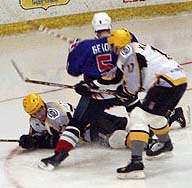 Ну и кароче началось хуярево, причем вроде бляхамуха - бескампрамисное: клюшки трищали, хаккеисты показывали нихуевую технику ударов, силовых приемофф - прям как по телику наши с канадцами када хуйаряца. Плюс ка фсему зрелищности добавило то, что троих игроков вынесли со льда от точных, бля, пападаний шайбой в голову.