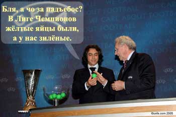 Дык вот чо там пра жеребьёвку-то. Как и предсказывал Дель Пьеро Ювентус вышел на английский клуб. Тут канешно Юве откровенно подфартило. Во-первых не наткнулся он на итальянскую команду, во-фторых хотя в восьмёрке лутших клубов европы слабых команд нет априори, всё-таки Ливерпуль пожалуй самая слабая команда из всех сильнейших. Эт не только мая мысль, так высказались в голосовании фтыкатели уефа.ком. Ну и в-третьих бьянконерри первый свой матч проведут на выезде, а если пройдут в полуфинал, то и там первый матч окажеццо выездным. Рассыпались там в улыбках и Капелло, и Недвед, и Дзамбротта, и Трезеге. А вот тренер Ливерпуля Раф Бенитес наоборот размазывал сопли па еблищу, и отмечал што-то наподобии того, шо шансы пройти в финал есть не плохие, но только не у его команды.