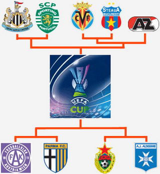 А следом прошла жеребьёвка Кубка УЕФА. Не дождались они пока соберутся все победители 1/8, т.к. один матч был перенесён из-за погоды. Вильяреал со Стяуай только в минувшее воскресенье решили, што дальше писдует Вильяреал.У Пармы появился реальный шанс, хоть как-то спасти сезон, ибо в серииА Парма уже борется за сохранение прописки. Попалась пармезанцам малоизвестная рядовому фтыкателю Аустрия.
