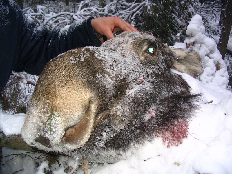 6085340Ага! Тоже видал, полшерепушки нахуй, как бритвой сохатый срезал. А дело так было, компания крайне новорусских товарищей поехала на лося, на хуй его знает какой день пьянки этих орлов пошли они наконец-то в загон. Кто лося положил я не в курсе, может и этот герой, кстати Блейзер у него был и прицел Люпольд, вместе штук на 10 килобаксов катит, ну и ешил он с лосиком сфотаться павшим...