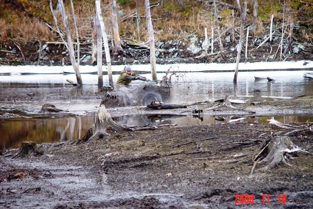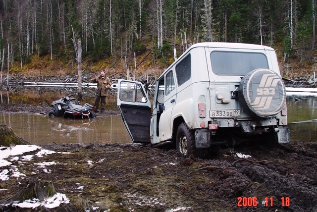 Как раскрыть тему утопления вездехода? Да очень просто! Надо саривнаваццо с жолтым в перескаивании по грязи и воде с островка на островок! Браццы! Во где адреналин то! Такой трассы не один васпаленный мозг проектировщека не придумает, точна вам гаварю. Вода, жыжа, грязь, снег, притопленные деревья, пни, какието ващще непонятные колдоёбины.. Степень сцепления траков с почвой меняется каждую микросекунду. Тормоза то работают, то нет, колеса вывешиваются вааапще не в соответствии с ландшафтом… Такое впичатление, что несешься не по земле, а чорти по чему, апсолютно без понимания, останешься ли ты жыв или разъебешься к ибеням через полсекунды.. Ну и в конце концов квадрик оказывается утопленным к ибени матери и пониженная передача и полный привод тайга посылает далеко нахуй вместе с наездником… все попытки вытащить не приводят ни к чему, а вызванный УАЗик несмотря на все военные ухищрения и блокировки мостов, лишь повторяет незавидную судьбу терпилы-квадрика…