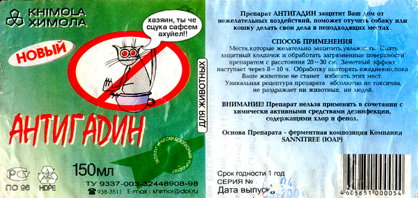 Да чево дашел прагресц! Пиздец! АНТИГАДИН (Трэйд Марк бля)! Препарат этот предназначен для того, чтобы ваши дамашнийе животные ни абасрали ваш дом и не ссали где им сцукам не попадя! Еще раз пиздец! Как такое ваабще блять придумать можно было, а? Гаварят, что этот препарат предумал еще до хуя времени назад лакей Пьера Безху…Безухова чтобы поручик Ржевский не срал ему в рояль. Но вазможно это пиздеж.