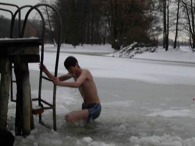 Дальше события развивались, как пишут в хуевых книшках "с калейдоскопической быстротой". Ширвинтъ живенько скинул куртофан и, даже не произведя разминки или употребления внутрь, спрыгнул в заботливо подготовленную алкашом прорубь. Еблысь!!!!! - и черные воды Комсомольского озера сомкнулись над его буйной головушкой. Пан Шляхцiч, судя по виду, уже начал забывать о своем бодуне и думал как бы отвертецца от такой культурной программы. Да вот хуй! Вынырнувший падонок Ширвинтъ выглядел вполне бодро, зубами не клацал и еще минут с десять циркулировал на свежем воздухе аки генерал Карбышев. Карочи вел себя как эскимос на пляже. Соотвесно, отступления Пану Шляхцiчу не было.