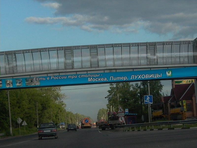 ваще эта надпесь с незапямятных времён периодически появляеццо на дорожных знаках при въезде в Луховицы, но на растяжках???