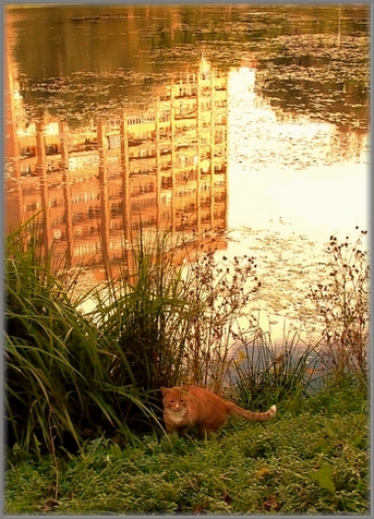 Кадр №2 Кошака надо было посадить и развернуть спиной к объективу. Получился бы задумавшийся рыжий кот на фоне рыжего отражения дома. Кадр с охуенной цветовой гаммой и подтекстом. Зритель припух бы от одной мысли, какие думки думает кот. А получилась хроника травли рыжего кота у ржавого пруда.