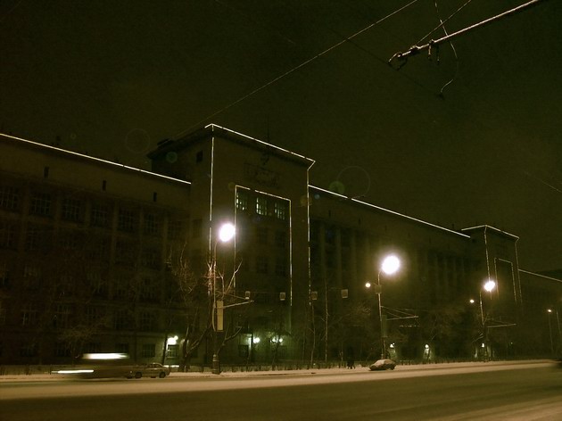 Кадр№6 "Здание Гестапо в выходной день". Все отлично схвачено, техника беспесды классная. Но доведи до ума. Усиль ирреальность, получишь эффект шока. Пусти косые линии снежинок, чтобы дом смотрелся Титаником, вплывшим в город. Или попробуй фотожопой "размазать" все машины в кадре, а не только ту, что мелькнула, когда ты щелкал спуском. Либо самопально налепи по фронтону слоган типа "Слава КПСС" или "Panasonic". Здание снято классно, оно давит на зрителя, цветовая гамма -- в копеечку. Только смысла или по-пиндостански "мессиджа" нет. Что хотел афтор сказать, осталось непонятным. Но явно не красоту нам демонстрировал.