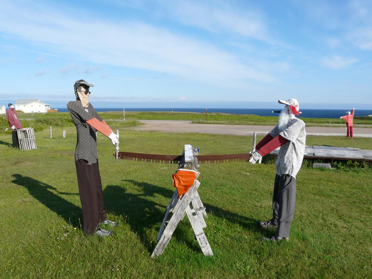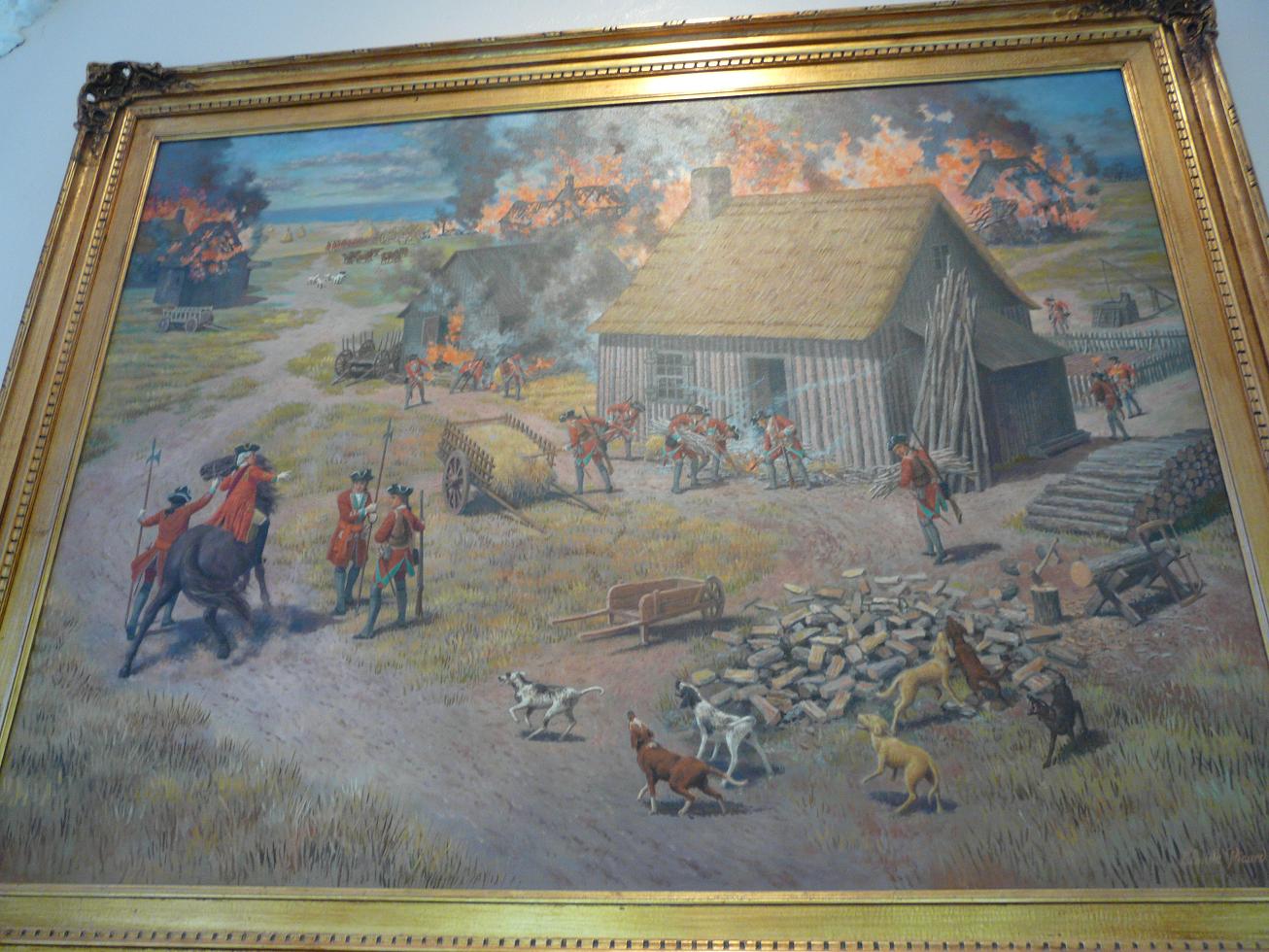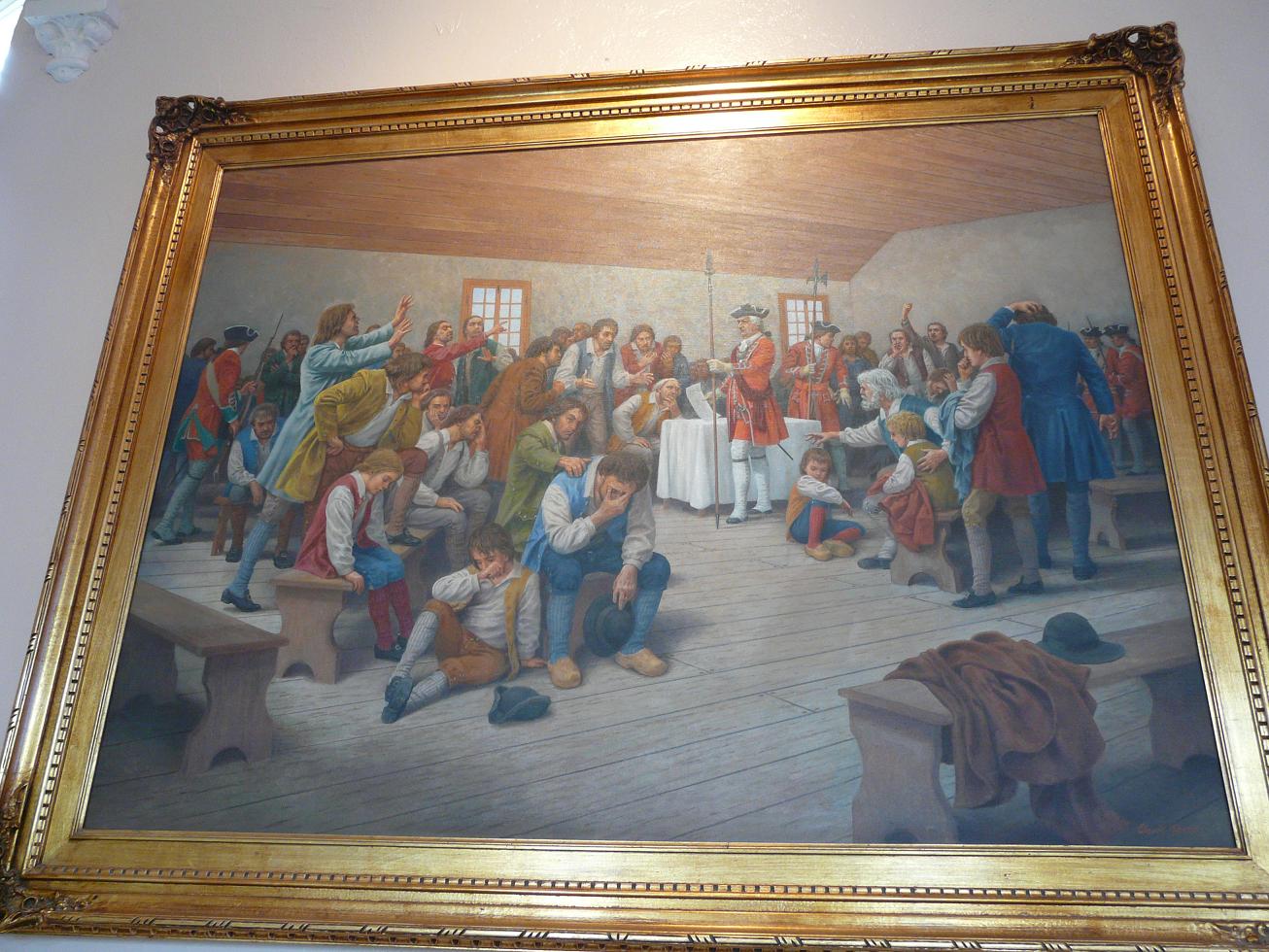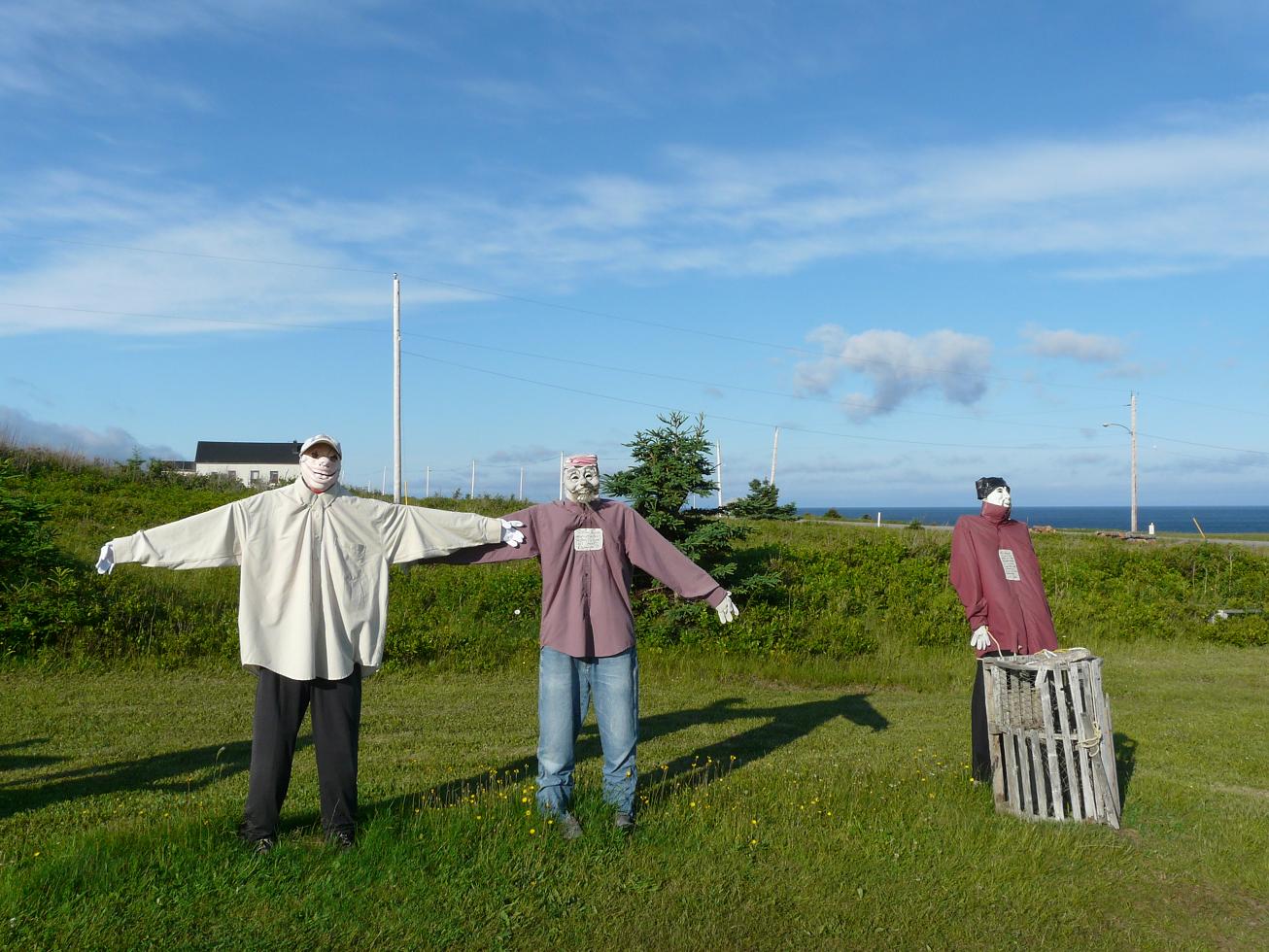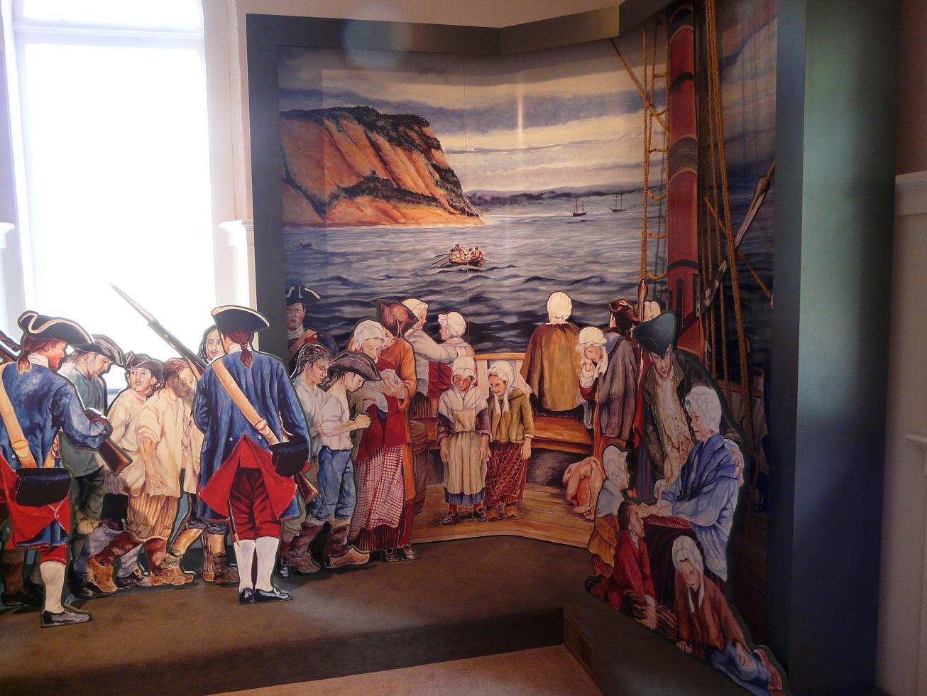 Покажу еще немного, где местные люди живут. Вот типа вот: 89-96. Кстати, 96 – хибара для туристов, можете снять прямо сейчас. По-видимому, это красивый народный обычай – возить мусор в прозрачном мешке напоказ (97). Но этот обычай – не единственный, который вас может удивить. Странные флаги, например, типа французские, но со звездой (98). Это осталось со времен Акадии (Acadia = Arcadia), попытки колонизации НС французами. Англия с Францией в те времена сильно конфликтовали в колониях. По Утрехтскому договору НС отходила к Англии, но местные французы отказались принимать присягу: тут куда ни кинь, как в Белоруссии в войну – или те замочат, или эти, или аглицкая влада или свои франкопартизанен. Лет тридцать тянулось это непонятно что, после чего англичане сказали – нах. И выслали всех непринявших присягу, с чадами и домочадцами. Эти события впечатляюще отражены в Музее Депортации, где, как в большинстве подобных музеев, очень мало исторических объектов, зато много художественных. Например, статуй (99) при входе изображает национальную героиню франкоскотов Эвангелину - полностью плод воображения пиндосопоэта Лонгфелло, специализировавшегося на создании эпических поэм о событиях, не имевших места. Бюст Лонгфелло, разумеется, тоже установлен. Также экспозицию украшают картины современного художника Клода Пикара на темы депортации тов. Сталиным чеченского народа… ой, я уже заговариваться стал – на темы, конечно, чюдовищных репрессий кровавого английского режима против благородных французов (100-103). Депортированные, впрочем, потом по большей частью вернулись в свою Чечню, поскольку никто нигде им был не рад. Вместо Чечни – читать опять же НС, пли-из.