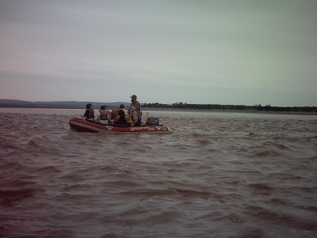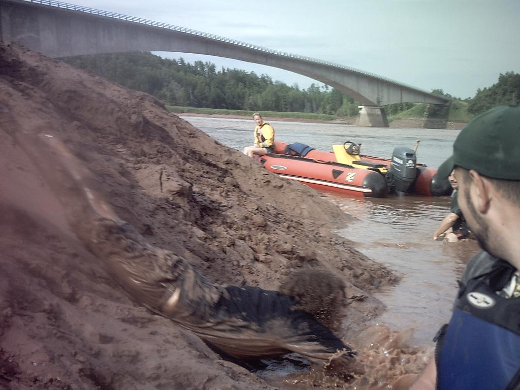 В общем-то это понятно, потому что действительность вокруг так хороша, а народ такой простой, что им хватает наблюдать то, что Бог создал (78, 79). Последние снимки - это уже не остров, это бухта Фанди, знаменитая тем, что там самый большой в мире прилив – 10 метров обычно, но бывало и до 20; 100 миллиардов тонн морской воды за раз, столько, сколько все реки мира за это время приносят в океан. Вот как это выглядит там, где прилив низок, на ширине: 80 - 82. Там где бухта сужается, реки текут вспять, возникают многометровые волны, что немедленно превращает эти места в парк развлечений – на надувных моторках (83-85). Нет, я не мог снять прыжки по волнам и счастливые миги, когда высоченная волна обрушивалась на лодку сверху. Кстати, там бывают и другие приключения. Плотность грунта при подходе приливной волны быстро меняется. И вот конкретно у этих ребят, что туристов возят (84, 85), один из их приятелей застрял в мокром песке чуть не по пояс. А десятиметровый прилив будет через 15 минут. Представляете ощущение, да? Ну, как-то вытянули, они ребята подготовленные, вообще-то. Там, впрочем, есть и попроще развлечения. Берега глинистые, и по этой мягкой глине местные катаются сверху в воду, как со снежной горки (86-88). Простые народные радости народа. Но отмываться потом приходится долго. Да, кстати, эта стихия так и не далась народному хозяйству. Ни одни попытка установить приливные электрогенераторы не удалась – энергия такая, что сносит все.
