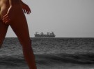 Тетя на пляже, играет в песочке, а рядом море, водичка.