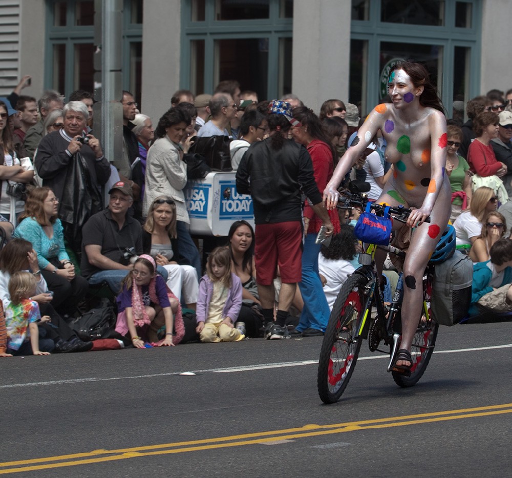 [Фото 6] Вот, например, мадам явно демонстрирует неуважение к правилам уличного движения – по закону штата Вашингтон нельзя на велосипеде ездить без каски!
