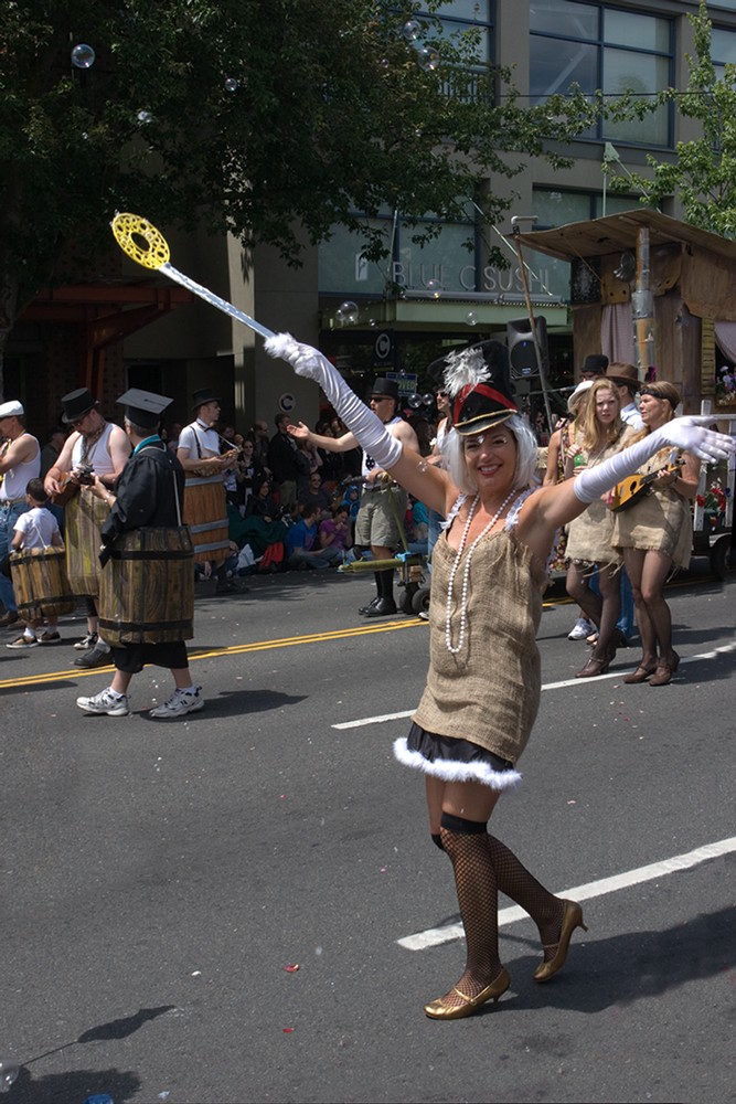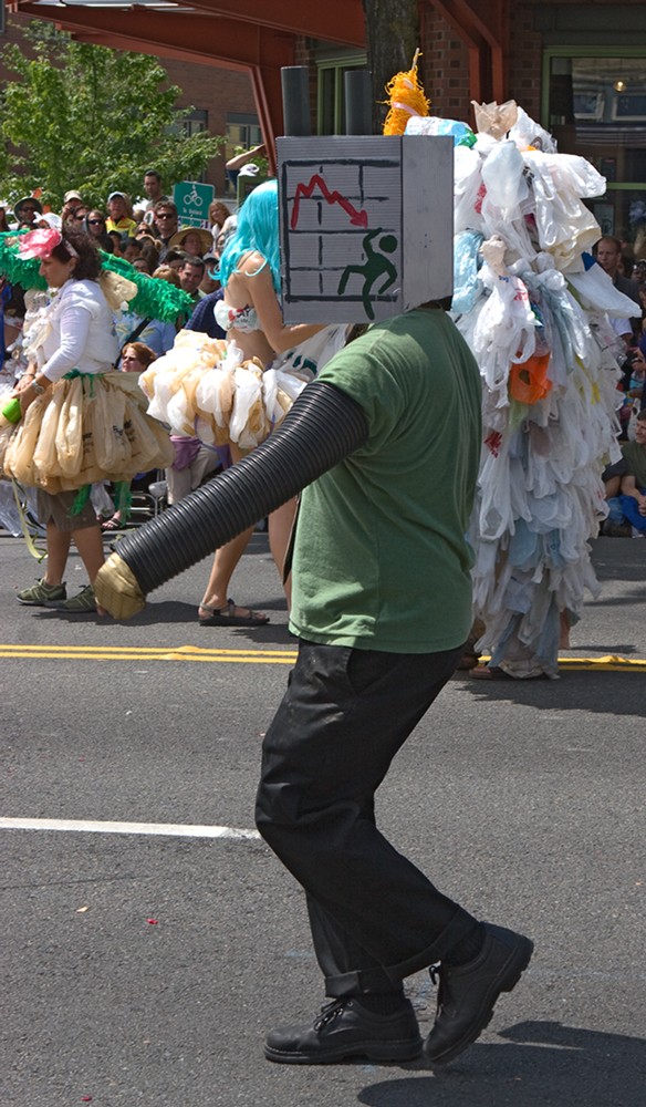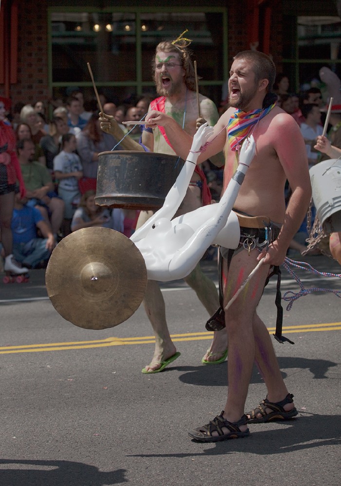 [Фото 9] На параде запрещена реклама в любом виде. Одно из требований к участникам парада – у них не должно быть никаких надписей и логотипов, идеи они должны доносить до публики другими методами. Интересно, что хотела сказать эта барабанщица в помойное ведро с банками из-под сметаны на сиськах?