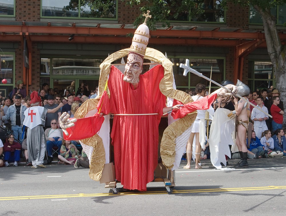 [Фото 11] Папа римский на колесах. У него за спиной крестоносцы в плащах и другие полуголые персонажи лезут в толпу и со всеми целуются.
