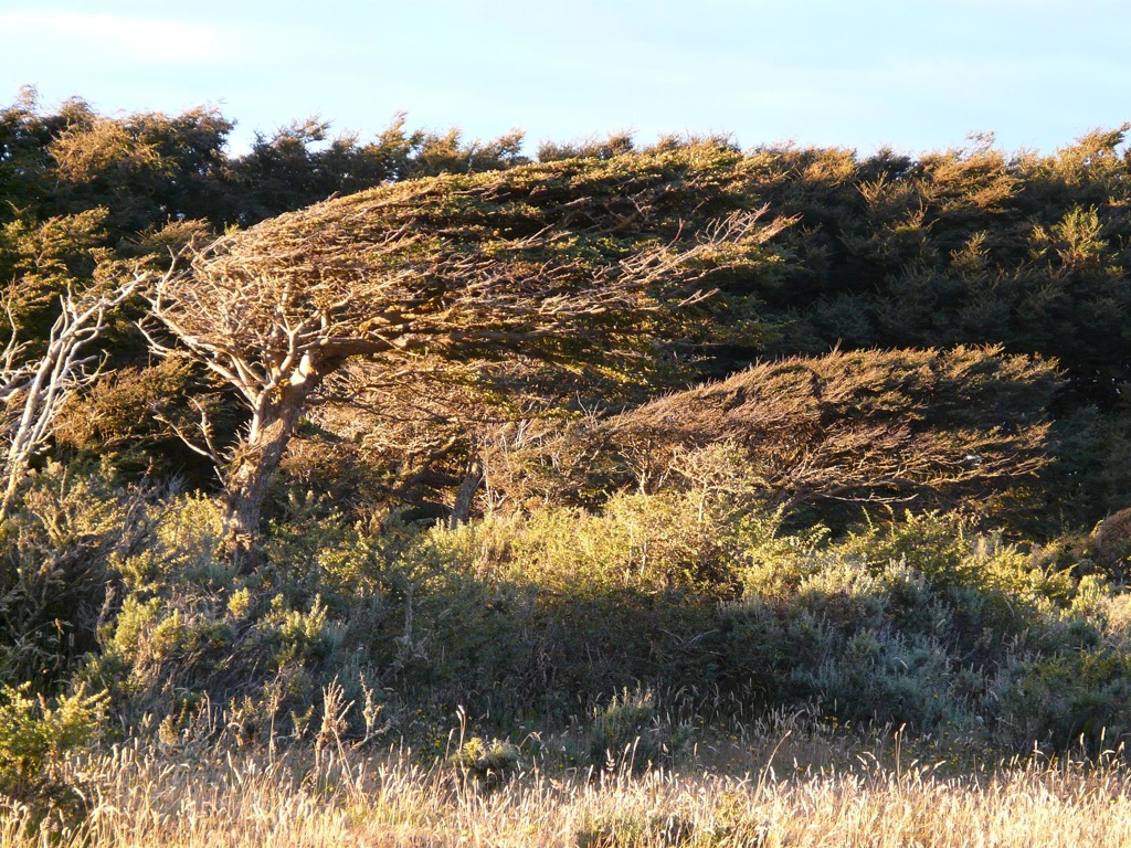 На закате даже овцы выглядят романтично (57). А местные деревья выглядят просто странно, будто они из мультика ужасов (58, 59). Если кто не в курсе, это делают с ними ветра. Там страшный постоянный ветродуй, погода на европейскую (даже на русском севере) совсем не похожая. Пингвинам это пофигу, конечно.