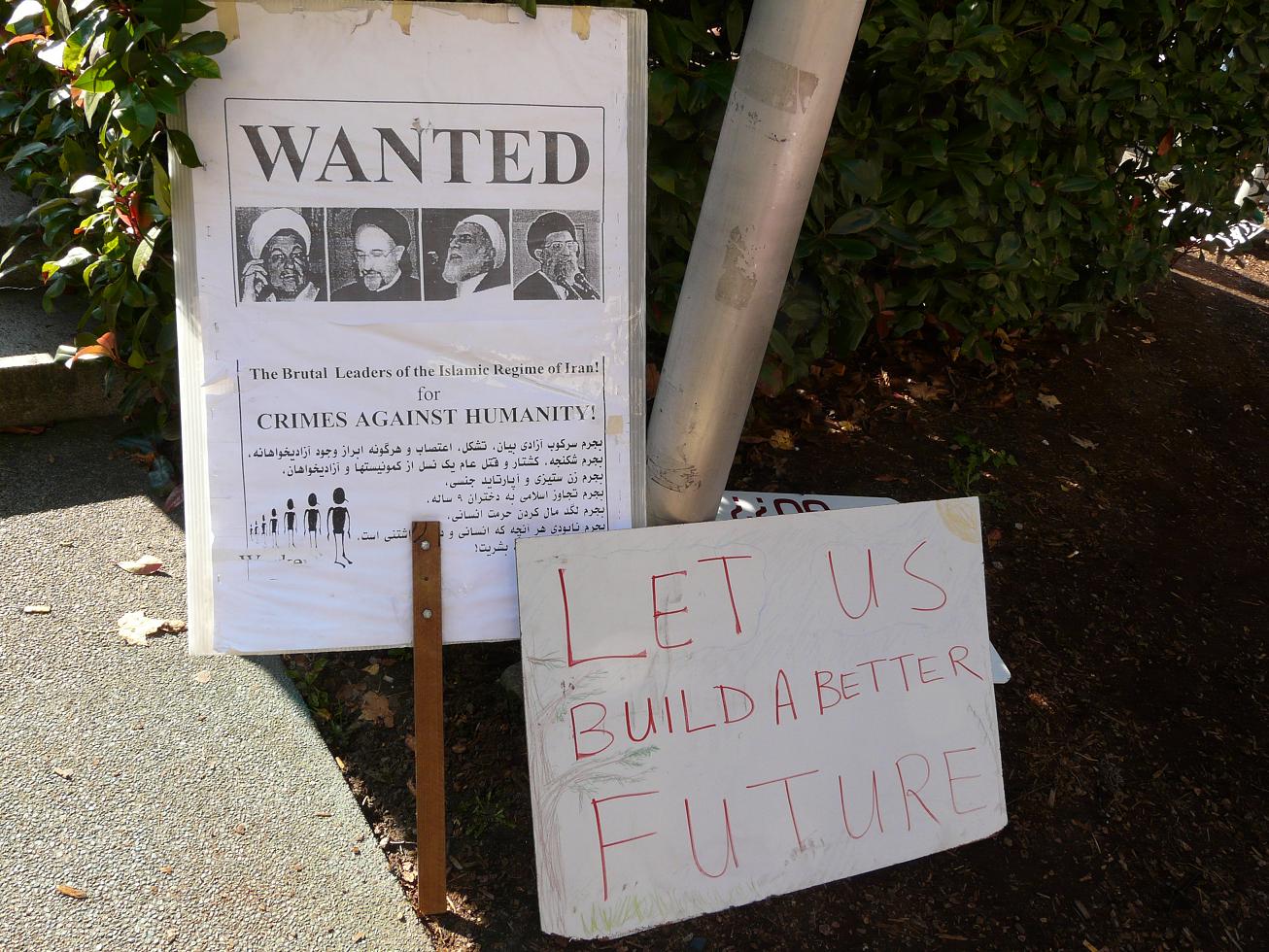 Фото сделаны в субботу. Посмотрите сами, какая публика – очень многое можно понять, просто посмотрев на них внимательно. Посмотрите сами, какие лозунги. Кое-что я переведу. Во избежание неоправданного недоумения – (а) это не галлюцинация, толпа канадских несогласных реально разношерстная, от недобитых коммунистов до недовымерших новых хиппи, с иранскими несогласными где-то посередине, (б) плакатики, за исключением стандарта «99%», самодельные, что, вместе со многими другими признаками, указывает на то, что контингент, в основном, не проплачен, (в) толпа очень мирная, с детьми и собаками, и функции полиции там чисто обеспечить им свободный проход путем умелого регулирования движения. Да, и это самый центр города (в Ване нет «главной улицы», иногда говорят – Робсон, но там неудобно было бы митинговать). Начальство народу не мешало, хотя федеральное правительство сейчас правое, ориентированное на бизнес.