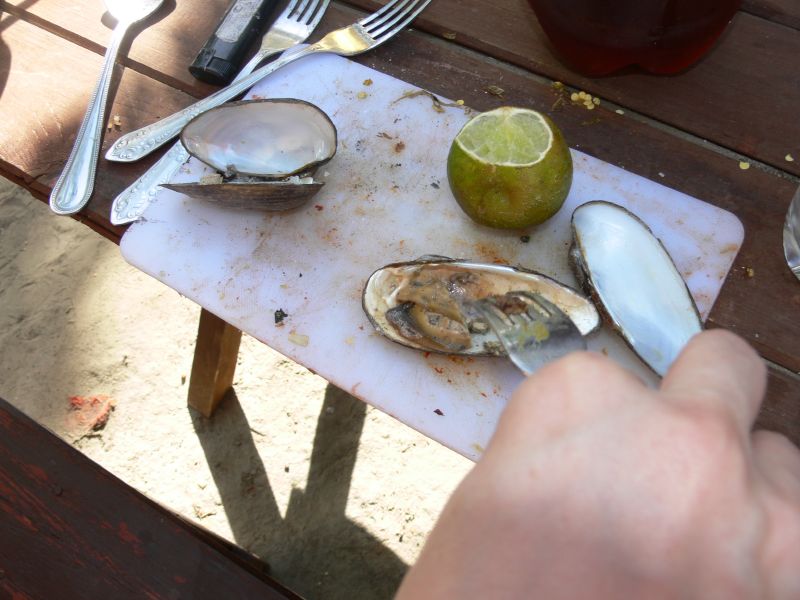 Обозначились и некоторые традиции типа добывания камрадами Мочканем! и Лешегом экзотического корма. На этот раз падонкофский стол украсился свежевыловленными мидиями. Дегустация удалась, ибо под вотку можно сожрать что угодно.
