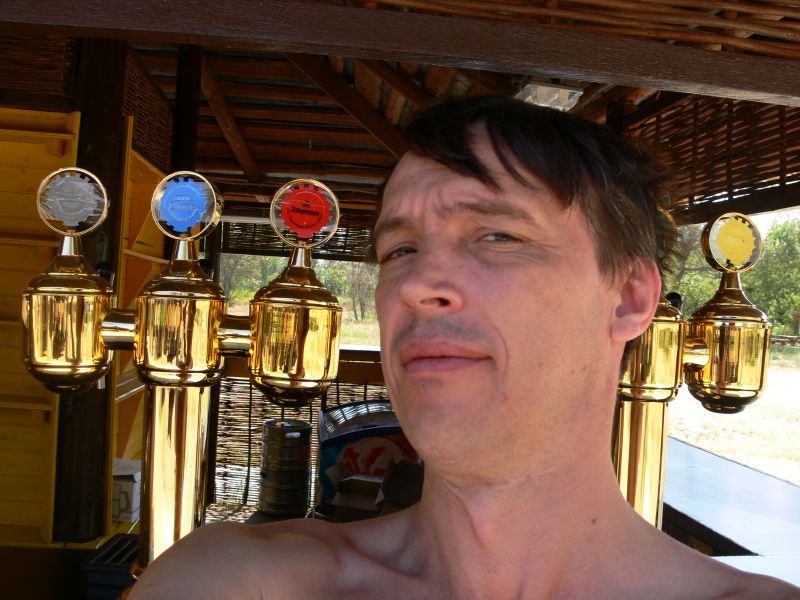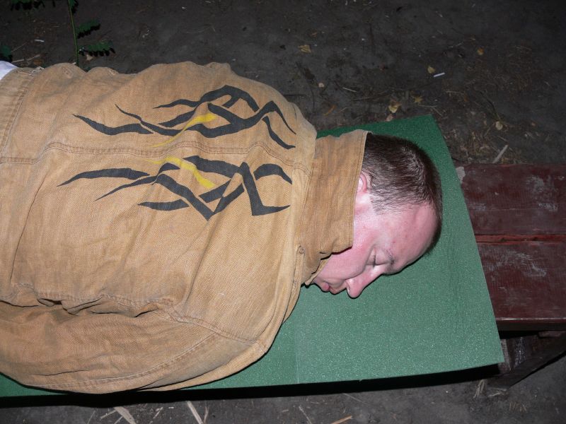 Рано утром наше стойбище являло собой весьма живописный пейзаж. Так и хотелось вслед за Пушкеным воскликнуть: “О, поле-поле, кто тебя усеял мертвыми костями”. Падонки спали в беседке, в палатке и на надувном матрасе размером с Эстонию. Кости, однако, вскоре зашевелились, восстали из небытия и принялись привычно жечь. К примеру, Растаман-Пиздопроходец на пару со Спецназом ГРУ (с дебютом на тусе, кстате) отправились в глубинную разведку и обнаружили пустующую барную стойку с пивными наливайками. Одна из наливаек оказалась заправленной пеффком марки “Халява”, чем падонки и поспешили воспользоваться. (ЫЫЫЫЫЫЫЫЫЫЫыыыыыыыыыыыыыы.........)