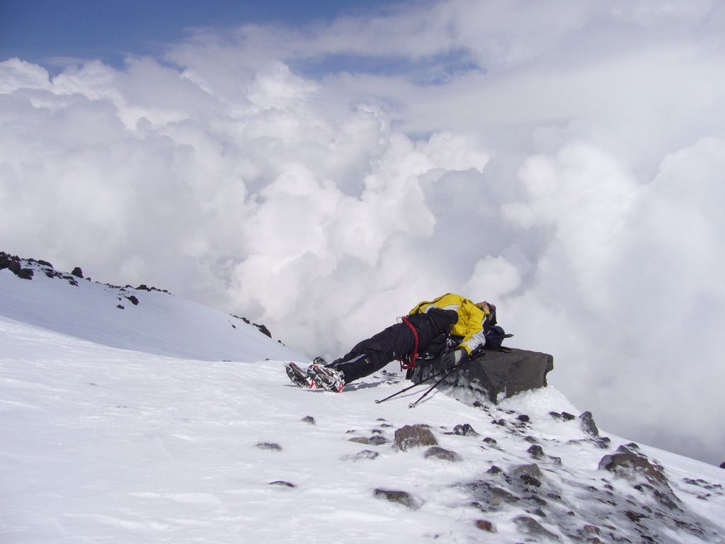 На пятый этаж с пивом в авоське подниматься не трудно, а на Эльбрус неделю акклиматизироваться надо, а потом 10 часов в верх, а потом вниз. в два часа ночи ушёл в двачаса ночи пришёл.сутки по горам лазиешь.