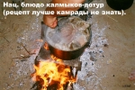 Древнее калмыцкое блюдо "кюр" - из барашка извлекают желудок, моют и складывают туда, как в мешок, нарезанные кусочки мяса. Затем закалывают в землю, разводят на этом месте костер и ждут. Не поверите - часов 15! Только после этого кюр можно подавать к столу.