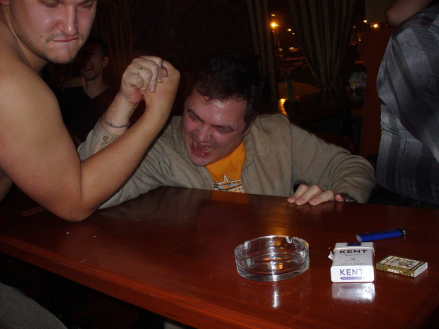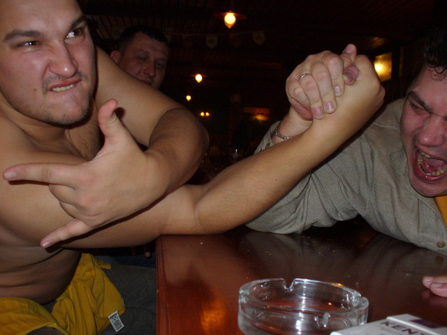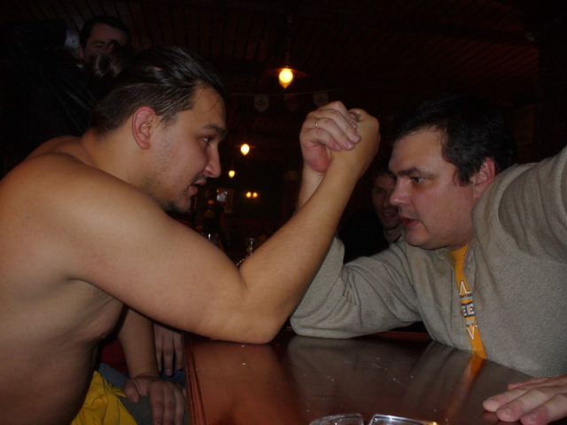 Мент рассказывал о нещасных блядях, мёрзнущих на улицах питера по 300 р за минет, плюс зажигалка на предварительный обогрев рта, Ебобат пошёл кого-то пиздить на улицу, а Осётр с Чингачгуком решили устроить мощщное хуемерялово, но почему-то остановились на идее армреслинга. Cоревнование завершилось триумфальной победой Чингачгука, ознаменовавшей превосходство массы над опытом…