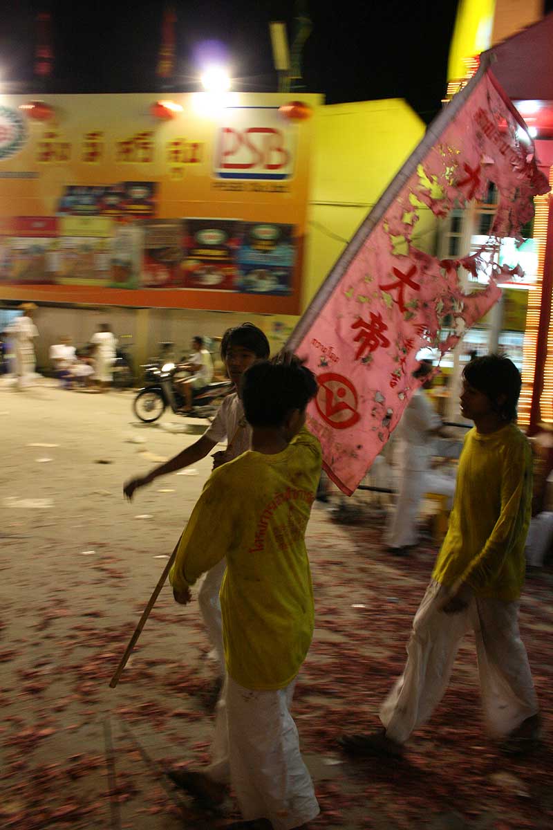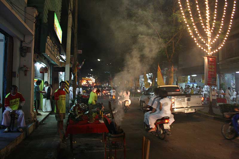 Кульминация фестиваля в этом году проходила в последний день, 19 октября, когда с закатом солнца на улицы высыпали все жители китайского квартала и участники всех предыдущих процессий. Снова все улицы квартала обносятся носилками с изображениями богов, снова Ма Сонг, тряся головами и бормоча в трансе тарабарщину, благословляют толпы верующих. И снова, но теперь уже в разы больше – бой барабанов и тысячи, миллионы петард.