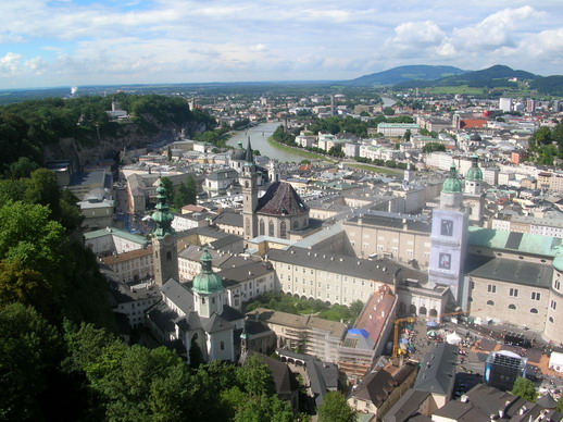 Австрийский город Зальцбург - родина музыканта Моцарта, весь город пропитан Моцартом и всем что с этим композитором связано. Хуева туча туристов шараёбит по городу, пожалуй можно увидеть и услышать весь спектр национальностей и языков. Основная достопремичатильность города невьебательская крепость на горе, хуй выговоришь название этой крепости. Короче город красивый, вокруг ахуительные пейзажи Альп и всякай хуйня - архитектура, домики, речушки и прочая поебистика.