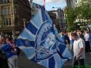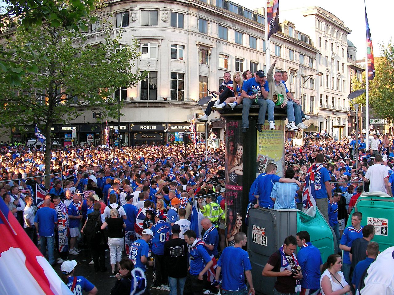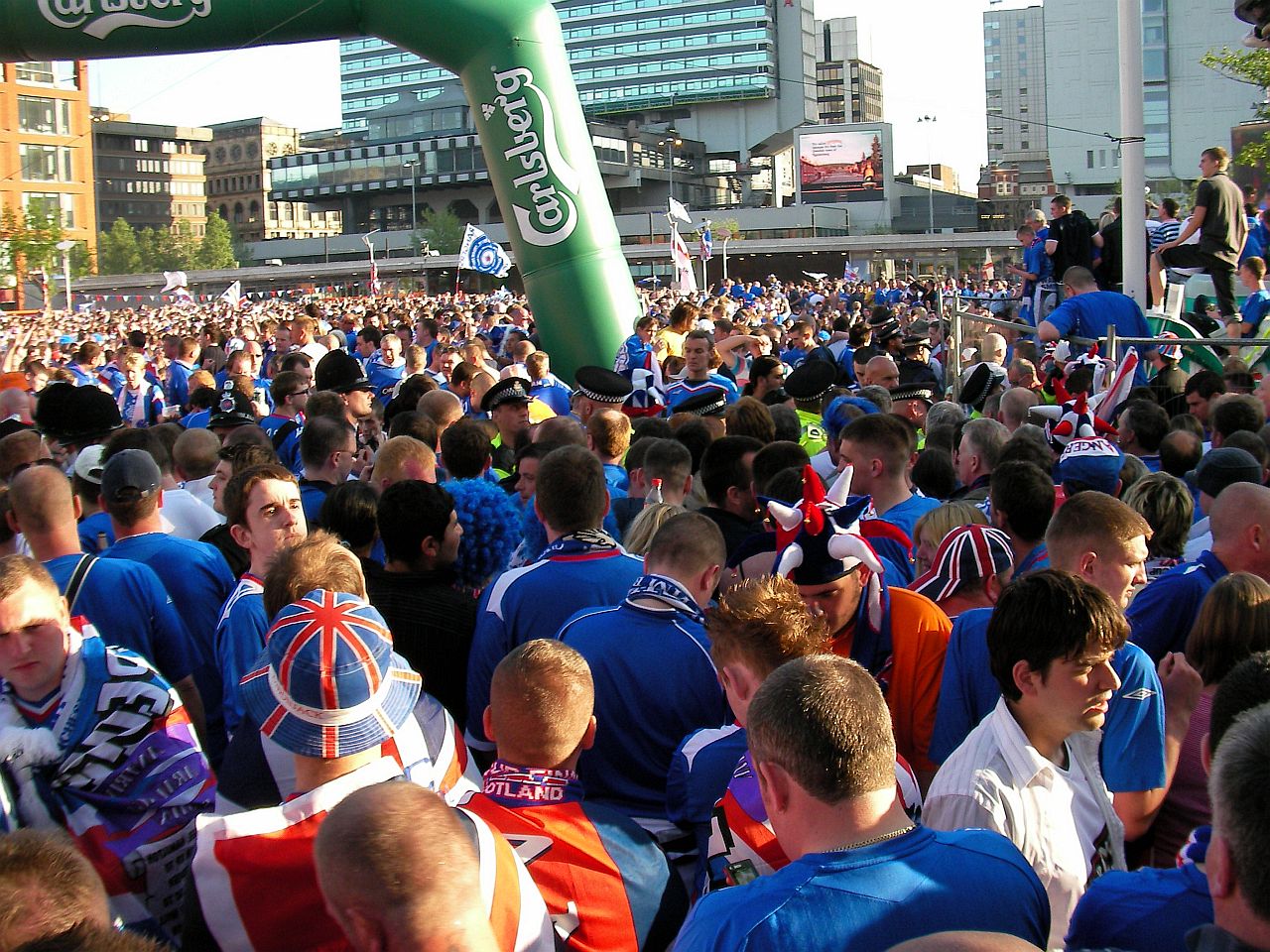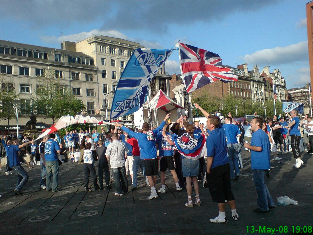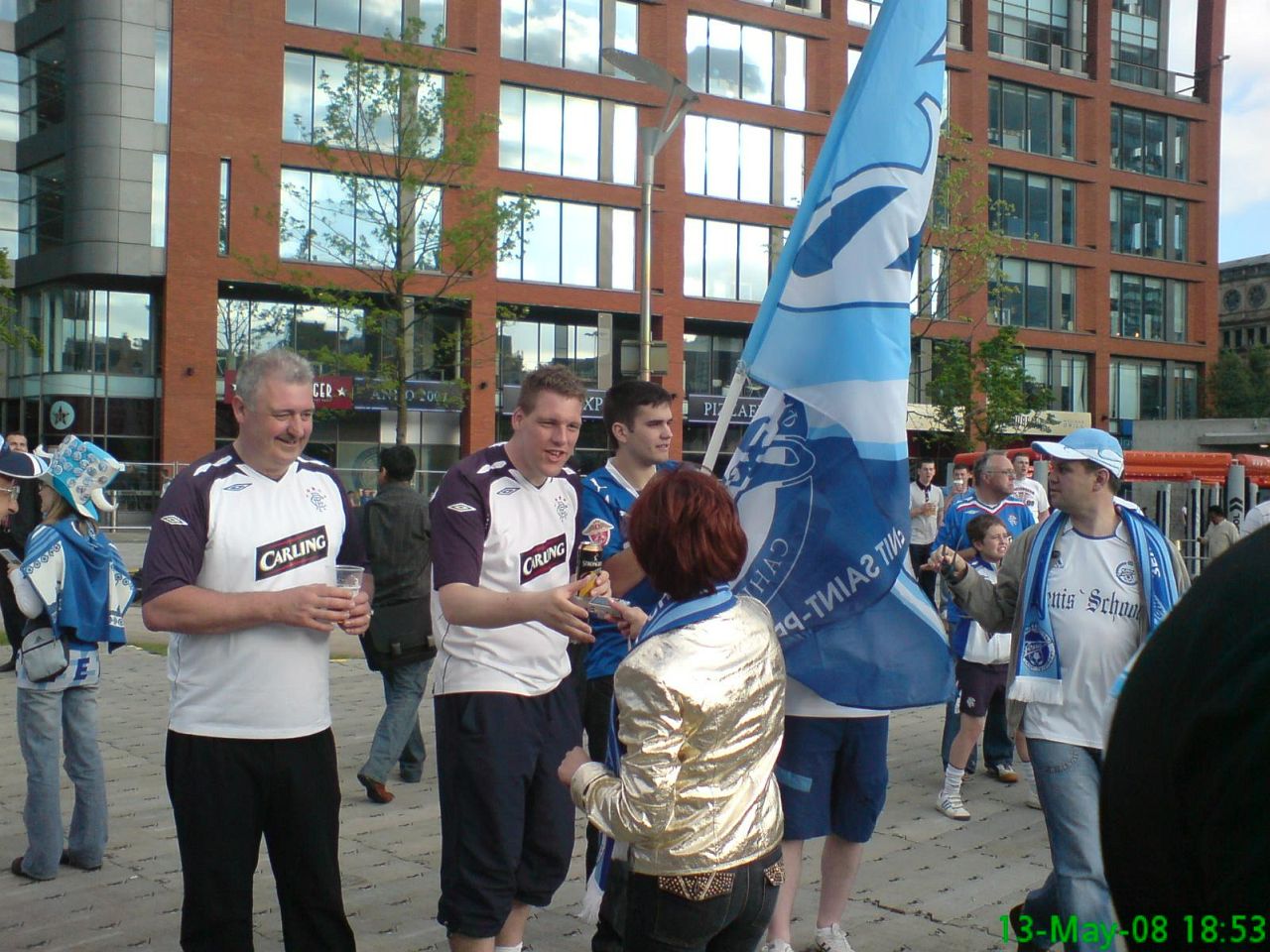 Наших питерцев я видел человек 50 отчаянных. Но! Рэйнджеровские фанаты были довольно дружелюбные и узнав что ты Russian, лезли брататься и меняться шарфами да майками.